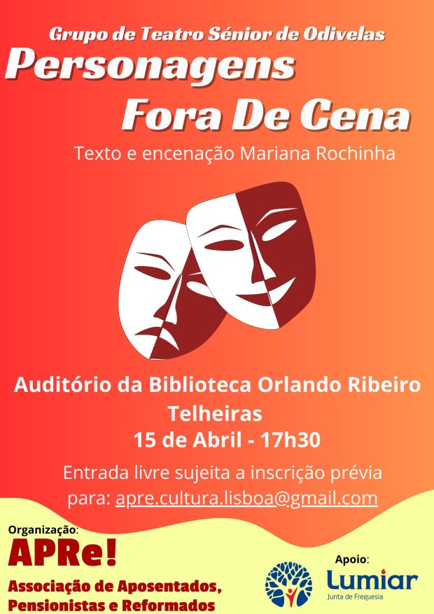 Na próxima quarta-feira, 15 de Abril, a delegação de Lisboa da APRe! – Associação de Aposentados, Pensionistas e Reformados leva ao palco do auditório da Biblioteca Orlando Ribeiro a peça de teatro “Personagens Fora de Cena”, pelo Grupo de Teatro Sénior de Odivelas, com texto e encenação de Mariana Rochinha.